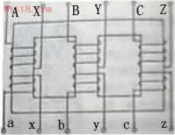 在三相變壓器中,每一芯柱均繞有原繞組和副繞組,相當于一只單相變壓器.三相變壓器高壓繞組的始端常用A,B,C,末端用X,Y,Z來(lái)表示.低壓繞組則用a,b,c和x,y,z來(lái)表示.高低壓繞組分別