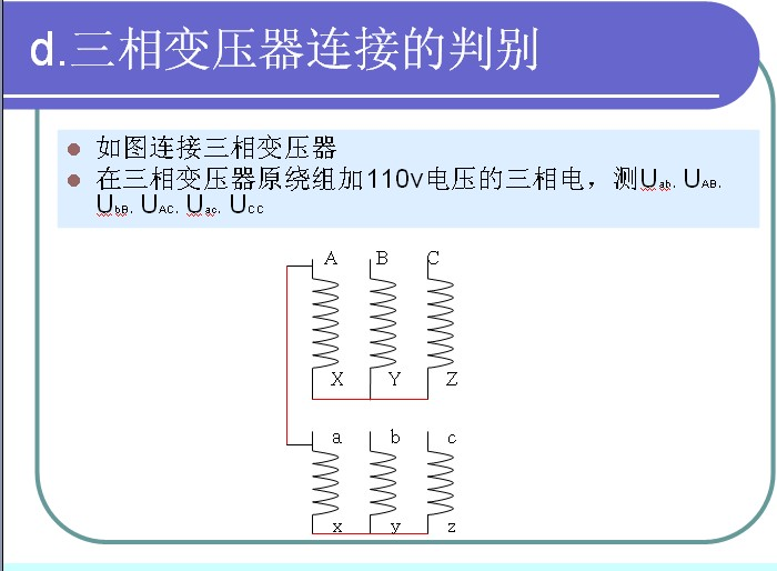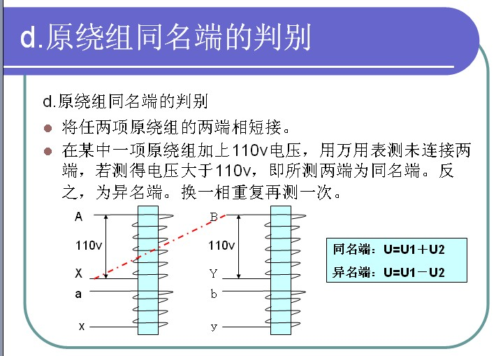 在某相原繞組施加110v電壓,測定三個(gè)付繞組中感應電勢,感應電勢最大的一組付繞組就是該項繞組的付繞組。